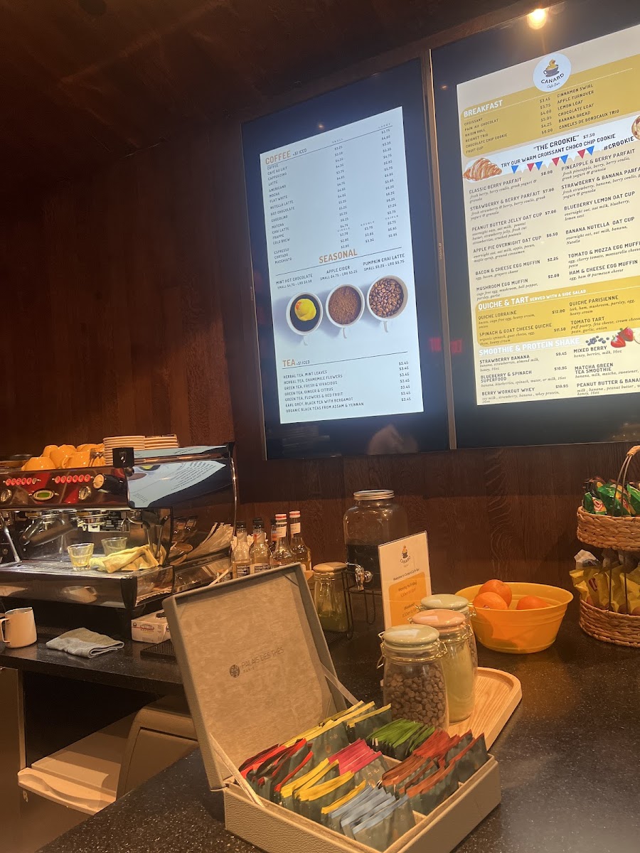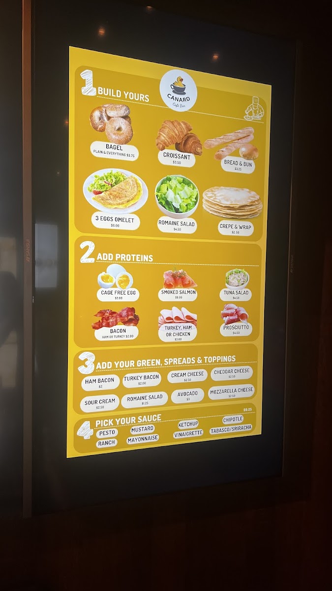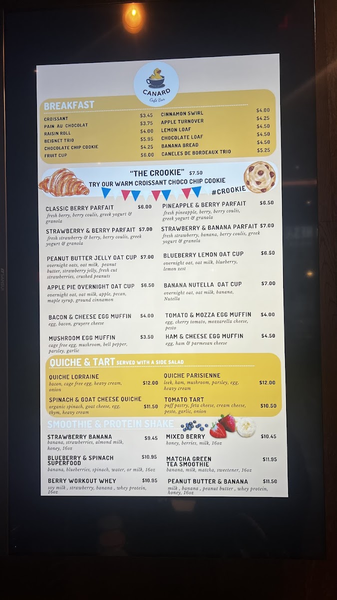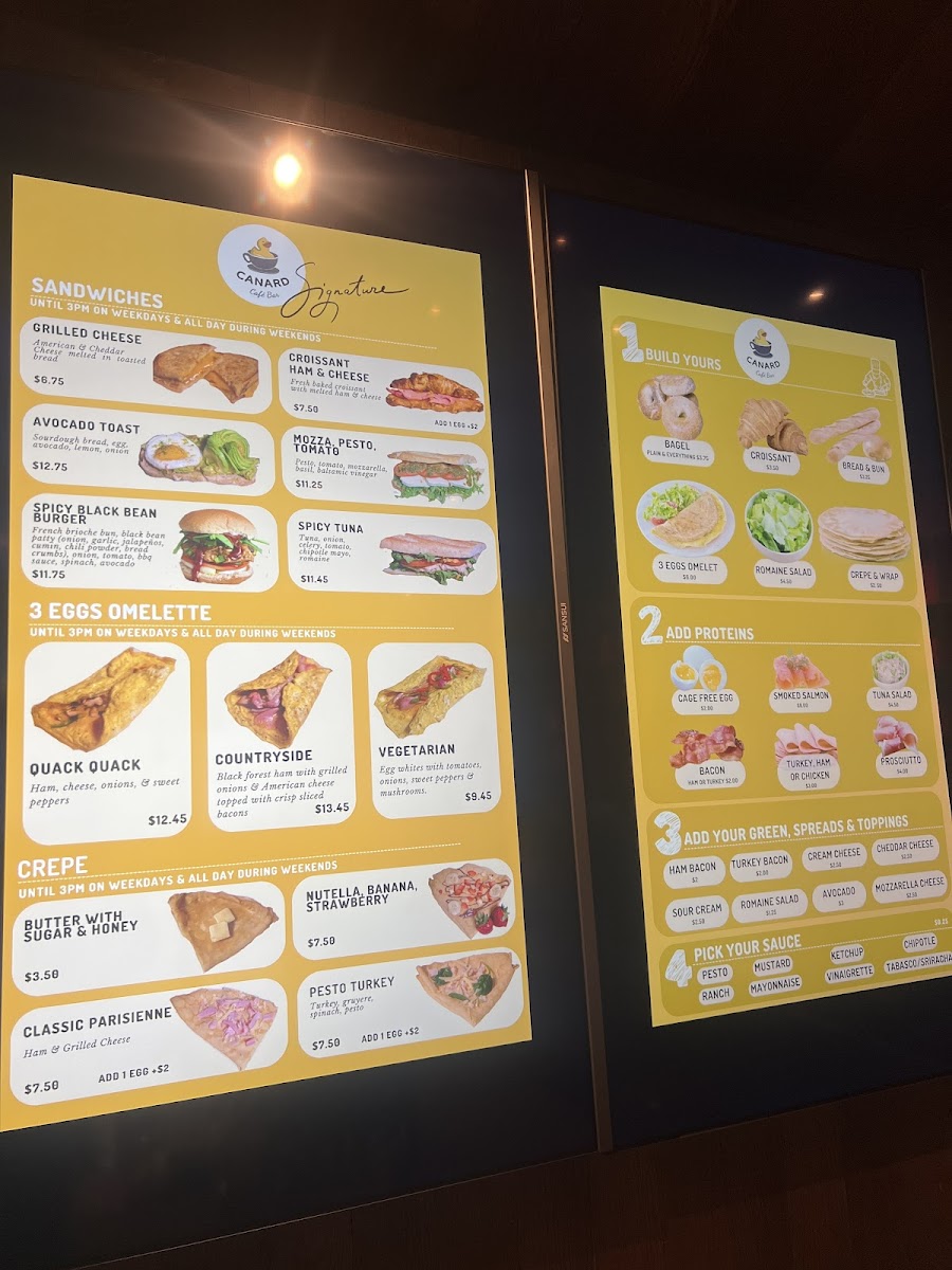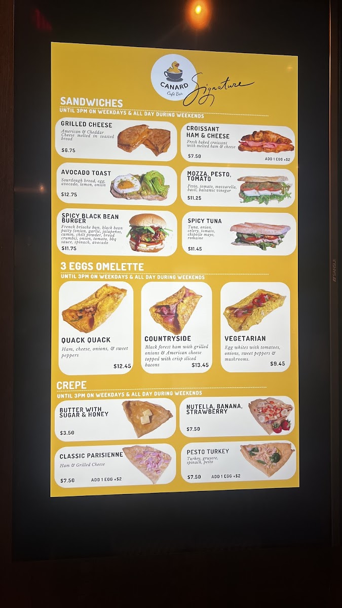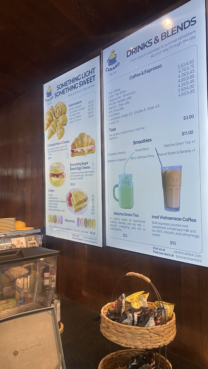 From a reviewer’s perspective, the menu at Canard Café Bar Stamford offers a concise yet appealing selection that leans into café-style comfort with a slightly elevated twist. The sandwich lineup-featuring items like the CROISSANT HAM & CHEESE, AVOCADO TOAST, CROQUE MONSIEUR, SALMON CROQUE, and SPICY BLACK BEAN BURGER-provides a balanced mix of classic and modern options, though the absence of clearly listed prices makes it harder to gauge overall value. The customizable 3 EGGS OMELETTE selections such as QUACK QUACK, COUNTRYSIDE, and VEGETARIAN add flexibility, especially with additional items available. On the sweeter side, crepes like BUTTER WITH SUGAR & HONEY, NUTELLA, and NUTELLA BANANA offer indulgent simplicity, while savory crepes including HAM & CHEESE, PESTO CHICKEN, and SMOKED SALMON cater to more filling cravings. The drink menu rounds things out with refreshing options like the STRAWBERRY BANANA smoothie, BLUEBERRY & SPINACH, and the MATCHA GREEN TEA SMOOTHIE, appealing to both casual and health-conscious diners. Overall, while the variety is satisfying and thoughtfully curated, clearer pricing would enhance the menu’s accessibility and transparency.